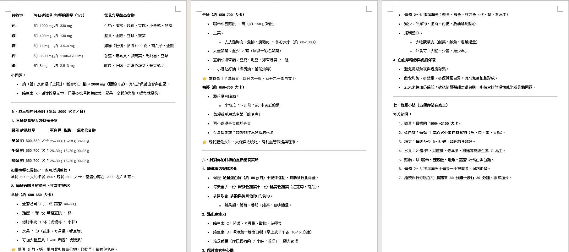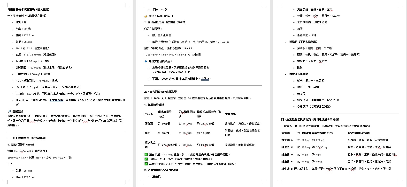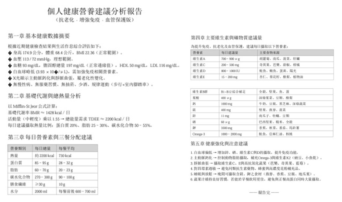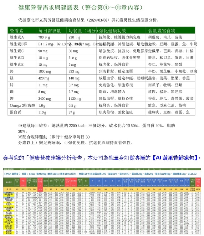 • 提問查詢(可酌修貼用):本人希望能改善健康狀況、增進體力、抗老化、強化免疫與保護血管,附件為本人之健康檢查資料及補充說明,請提供「健康營養建議分析報告」回覆本人每日應有的基礎代謝率和含活動係數所需之熱量、所有必要營養素(維生素、礦物質…) 的份量,並也請均分為三等份量,同時請告知有哪幾種常見食物含量較多?