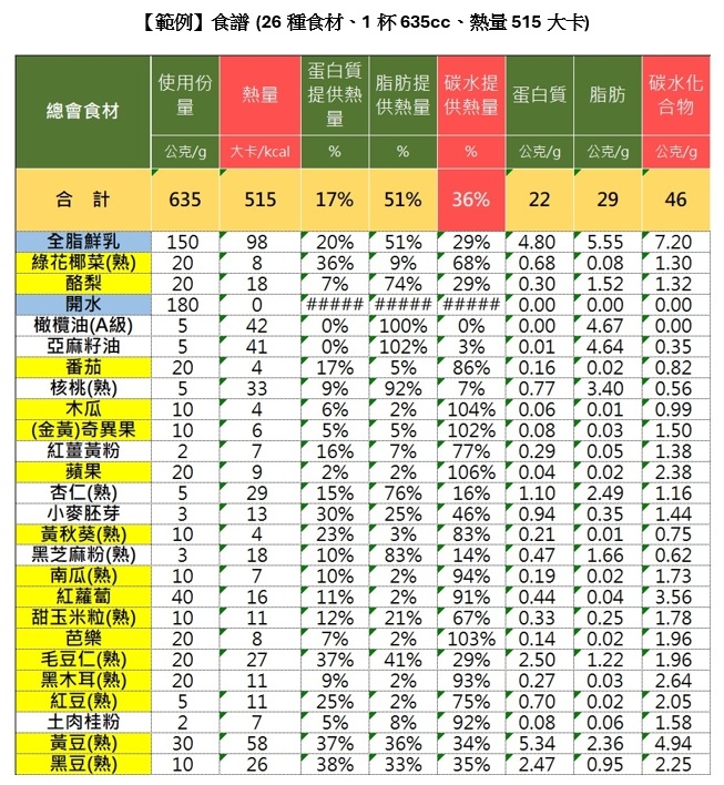 • 由於「分析報告」上的營養素繁多,為了能均衡從六大類食物攝取,選用食材會是少量多樣化,且用量會略有多寡連動,亦會有某營養素因食物來源少或非有機而從缺。故本公司會提供「您的營養素需求與鮮凍包含量對照表」,以供參知。