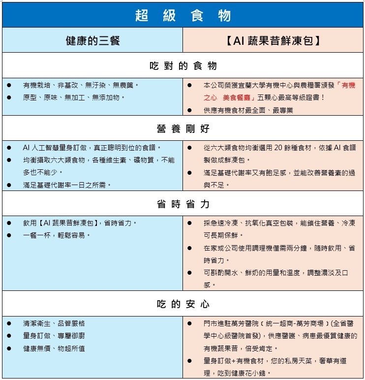 • 屆時您若有需要專屬的【AI蔬果昔鮮凍包】食譜做參考,可通知本公司免費為您製作。